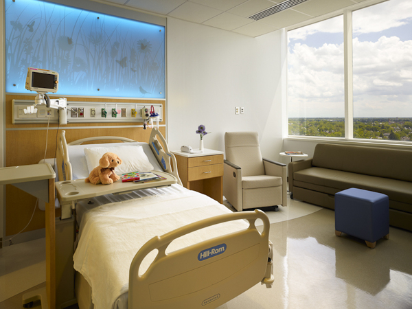 一般醫院多為一間病房有2~3間病床并配有衛生間,病房門入口凈寬應為1050mm,以保證單架車出入,門套應能抗沖擊。壁柜按每床600mm即可。座便器選用后背懸掛式對清潔有利。床頭柜可用懸掛式。天花不易有多種造型,多用礦棉板或紙面石膏板。輸液架預埋龍骨。燈光應多路控制。開窗為內倒開為宜,以滿足通風、安全防護、方便清潔三種需要。入門口玻璃要選擇透明無色。