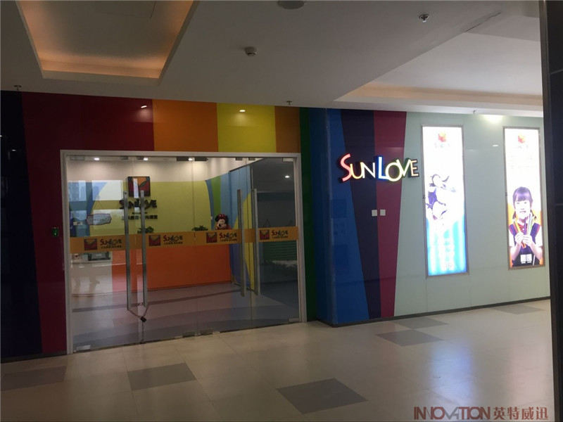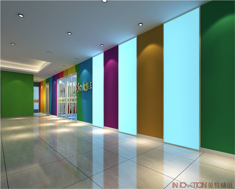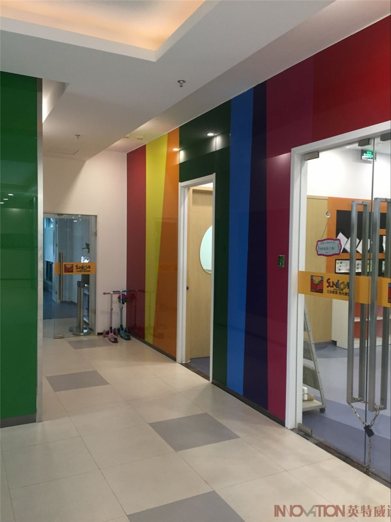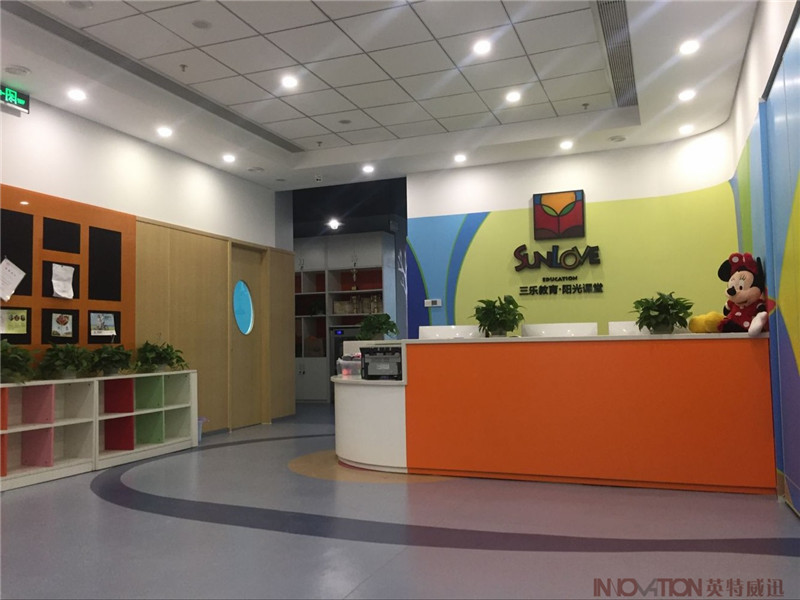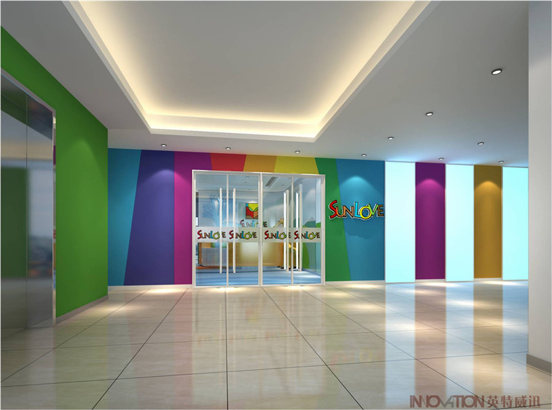 進入大廳,首先映入眼簾的是入口門廳和logo墻,設計中大膽使用色彩鮮明的跳躍性線條,更好的體現個性化教學的特色。