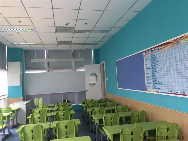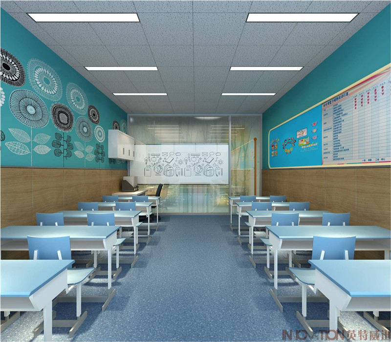 教室設計以藍色背景墻面為基礎,和室內課桌的藍色相呼應,給人一種藍色海洋的清爽感覺。墻面圖案樣式多樣,顏色豐富,突出圖案的多樣性和多變性。