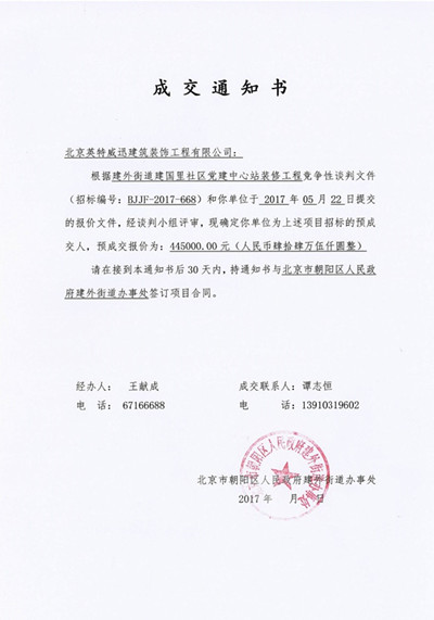 根據建外街道建國里社區黨建中心站裝修工程競爭性談判文件(招標編號:BJJF—2017—668)和英特威迅于2017年5月22日提交的報價文件,經談判小組評審,現確定英特威迅為上述項目招標的預成交人,預成交報價為445000.00元(人民幣肆十肆萬伍千圓整)。