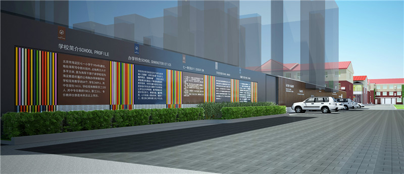 3.呈現學校LOGO的墻面作為校園和社會的分界線,圍墻在保護校園的同時也是社會觀察校園的重要途徑,而學校LOGO具有識別和推廣作用,能讓社會記住學校主體和品牌文化,在圍墻上設計學校LOGO,以其簡約、優美的造型語言向社會呈現學校品牌特點和形象。