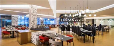 全日餐廳采用簡約的線條,將摩登現代與西式簡歐元素于一體的餐位設計,為賓客營造典雅的用餐氛圍。
