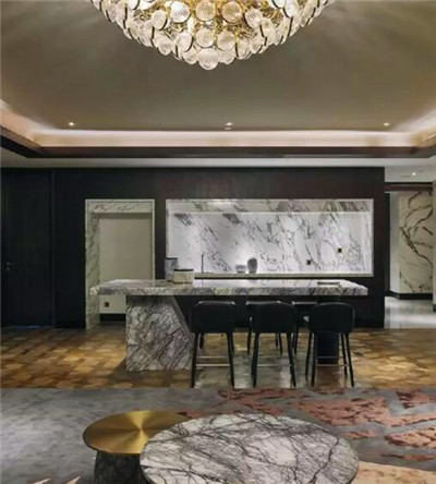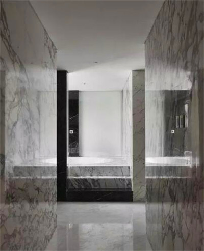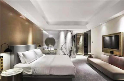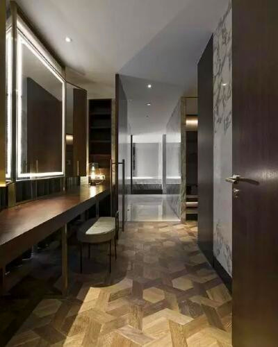 客房的設計打破了常規的設計,尤為鮮明的是浴室與臥室之間的不規則六邊形大理石,這間大理石淋浴房的存在分割了整個客房的規則布局,更是與客房內斜線的細節設計交相呼應。