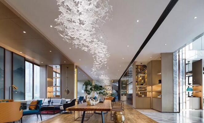 “夫畫道之中,水墨最為上。肇自然之性,成造化之功。”雕塑“墨舞”以濾盡色彩剔透琉璃為墨,飽蘸筆觸,起承轉合,縱橫貫穿于洽談區,成了空間最純粹的風景。