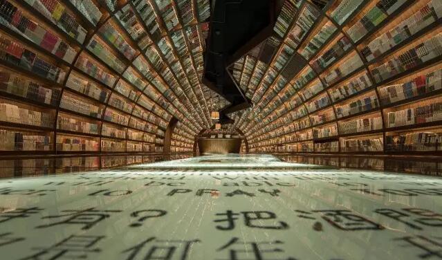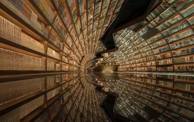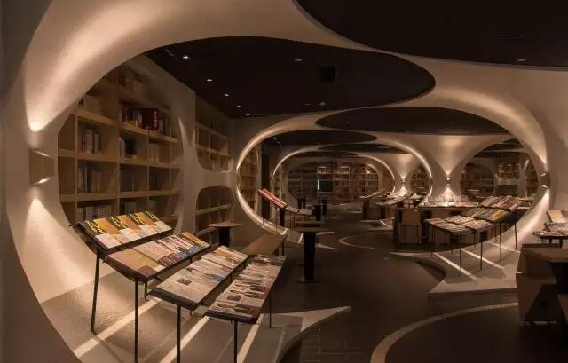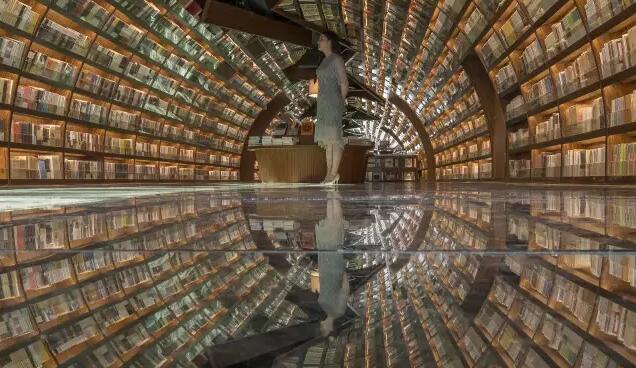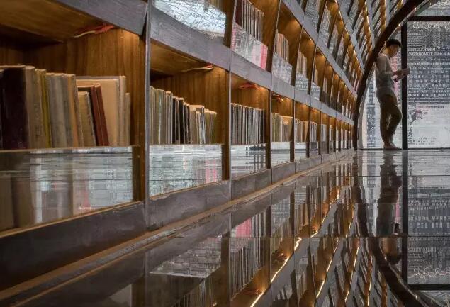 走入揚州鐘書閣的正門則是書店的前廳通廊,設計師利用揚州本地拱橋的概念,巧妙地延續了鐘書閣書天書地的視覺符號。在地面與天空中的河流鏗鏘前行中,引領著讀者沉入到浩瀚的知識海洋。兩廂的書架用優美的弧線結構拉伸成天際線的形狀,宛如溪流之上的橋梁,搭建著人與書籍之間的那座心靈橋梁。進而前行至右側則是更加廣闊的書籍之地,拱橋及河流的關系給了設計師無窮的靈感,于是得到此處的上下鏡像的空間關系。設計師還利用各種拱形來連接各個區域,每一位讀者進入這個空間,就能充分感受到這空間帶來的震撼。鏡像、拱形加上柔和的燈光,這一切所帶來的迷離感,會讓讀者不由自主地想起橋下的波光粼粼,悄然靜思中達到心情的平和,并享受讀書的快樂。由各種波起伏連接而成的空間,保留了足夠的尺度,以便留給給讀書分享會的讀者分享的場地。