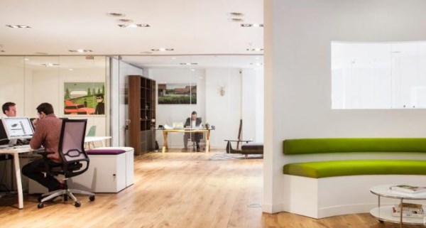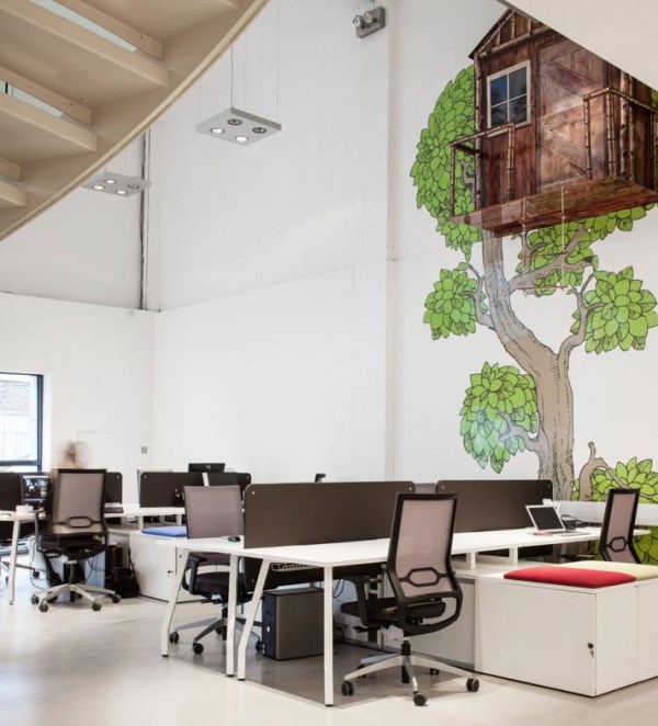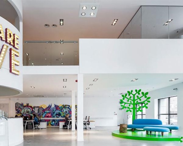 接待區中心的裝飾樹像是邀請顧客到藍沙發上來休息,想象一下在這個創造力十足的空間工作吧!通過一些細節鼓勵創造力和合作,能夠填補員工之間的間隙。