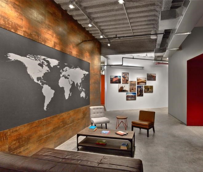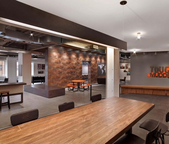 每個元素看起來都十分隨意,不過卻專業(yè)并且十分友好。從模仿考頓鋼的墻面到重新利用的木頭、印著Tough Mudder標志和簽名的水泥煤渣磚會議桌。該設(shè)計提供了一個現(xiàn)代美感與工業(yè)化魅力結(jié)合的空間。