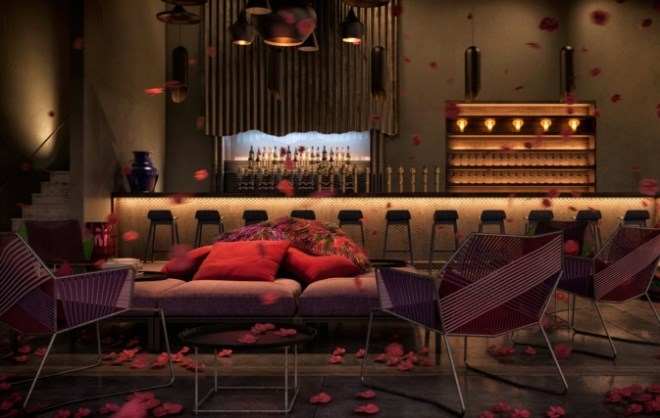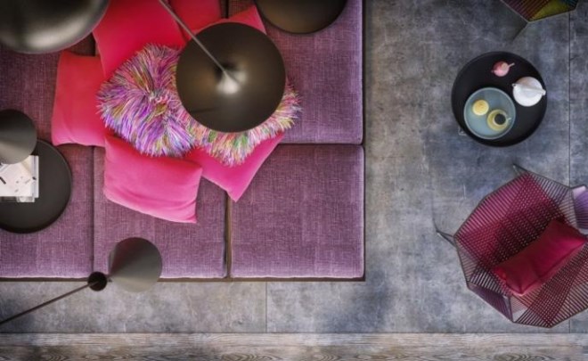 薰衣草色、粉紅和紅色的陰影正好和地板的炭灰色形成了平衡。吧臺旁邊有一排藍色的腳凳,只有一個藍色的花瓶帶來另外一種顏色,形成中立的裝飾。