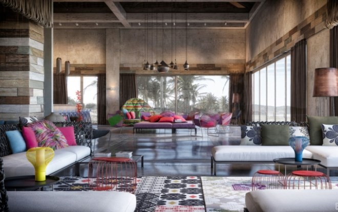 大廳是開放式的空間,用十分有活力的顏色和天然的紋理搭配橫縱向充斥著空間內(nèi),使得其十分舒適。大廳的墻上有12張圖,這些藝術(shù)品的顏色是對大廳其余部分的沉思,展示在墊子、花瓶、家具和地毯上。