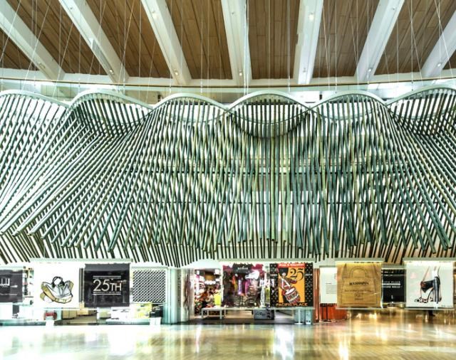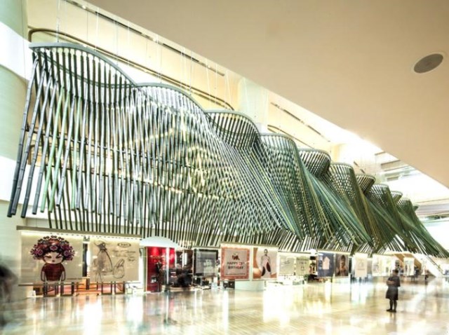 廣場的長走廊是“Hall of Fame”,用現(xiàn)代的鋼架結構,靈感來源于中國傳統(tǒng)的錄音方法。鋼架結構下懸掛的原生竹子以及纖維玻璃創(chuàng)造一個彎曲的絲狀的表面。