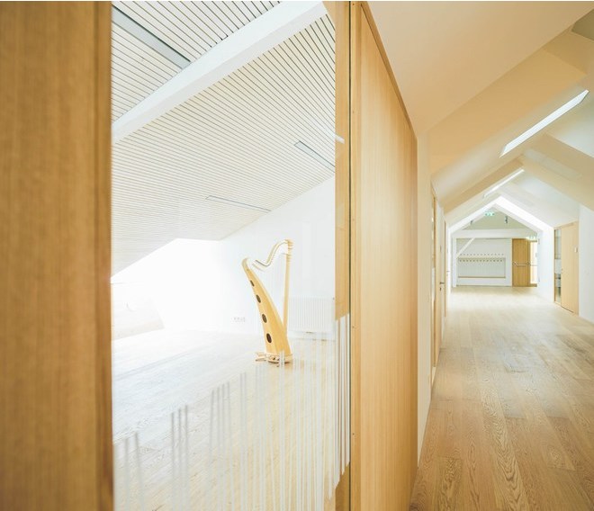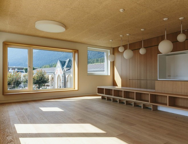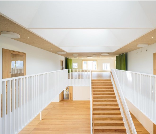 幼兒園的核心是其交通空間,寬敞的樓梯被一個畫廊環繞,雨傘狀的錐形天窗提供了人工和自然光。