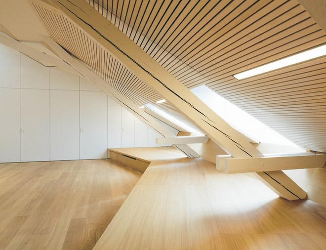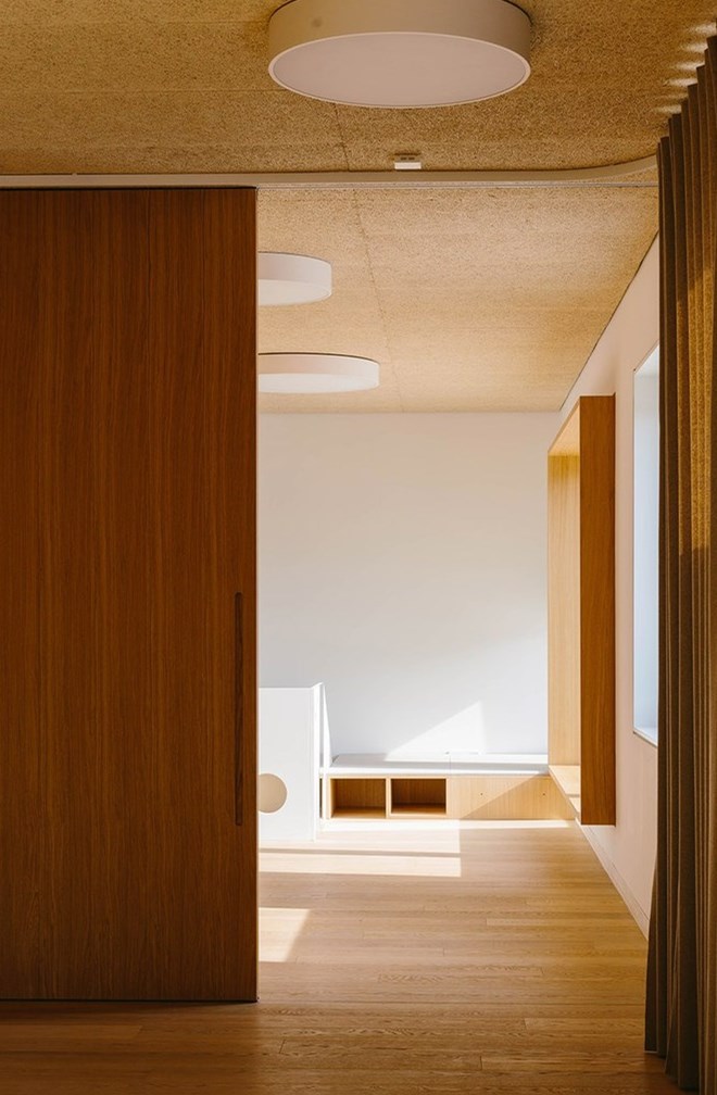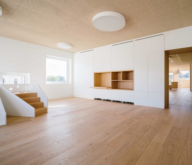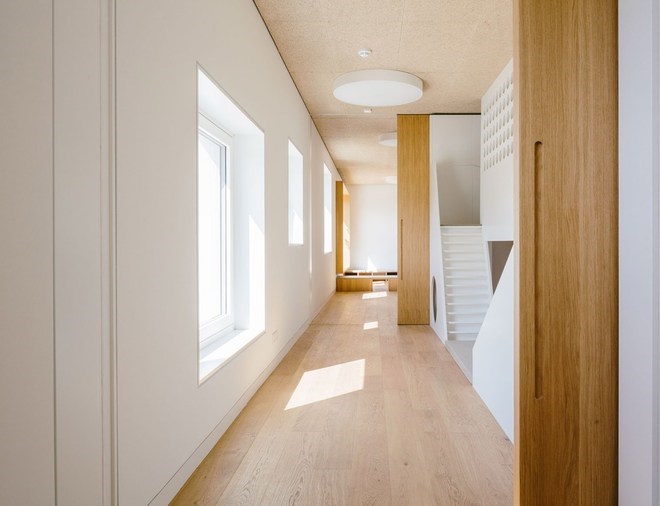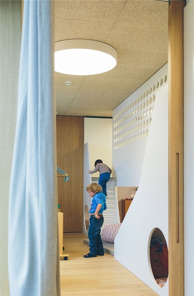 樓梯直接通往公共用餐區,它與八組兒童房間相連組成了一個巨大的共享空間。孩子在這里學習娛樂,所有空間都均質排布。建筑師設計了大量的被動式節能屋。