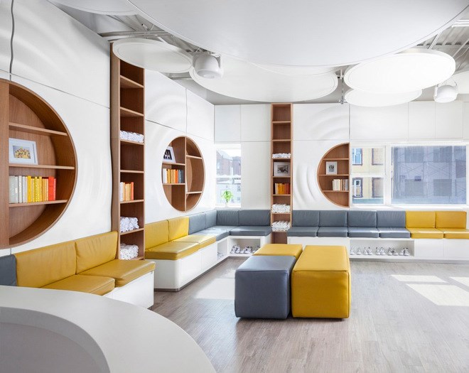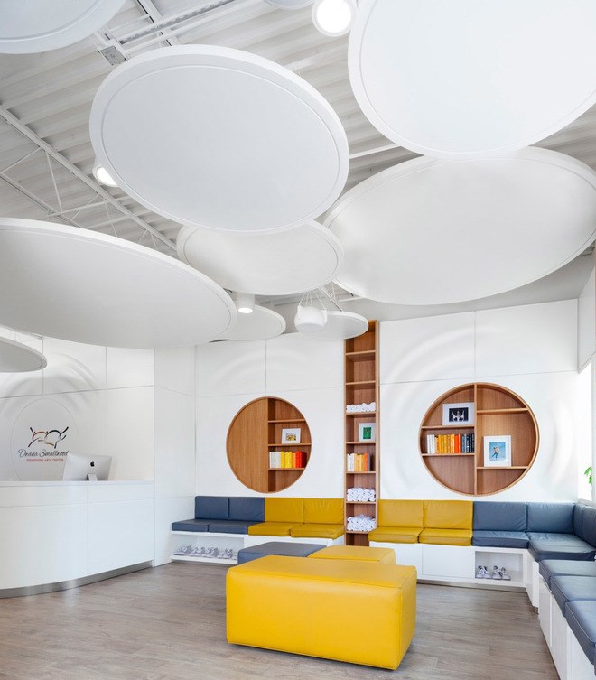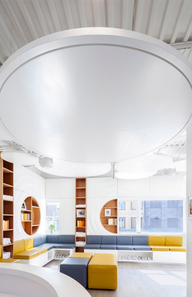 圓形的波紋圖案組成了一個色彩豐富溫馨的圖書室,設有舒適的座椅和社交空間,人們可以安靜地閱讀書籍,做伸展訓練,或是和朋友加深交流。舞蹈教室設有彈簧地板和明亮的天窗,為舞者創造了絕佳的環境。兩間教室之間采用可變隔墻,在演出時可以將隔斷完全打開,形成一個帶遮光簾的巨大舞臺。