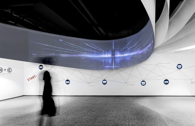 未來空間不論在視覺上還是使用方式上,都離不開科技與人的融合。此次設計,峻佳的關注點在于,當人走進這個空間,他的每一步在思考什么,感受什么。通過每個空間不同的設計旋律,創造多種可能的體驗。來訪者坐電梯到達展廳大堂,經過時光隧道,融入設計之中。移門緩緩打開,象征著思考的頭腦風暴映入眼簾,懸掛于中樞核心區域,展示著品牌的高度。峻佳打破固有的設計思維,創造了一個超現實主義空間,讓人沉浸其中,思索未來。