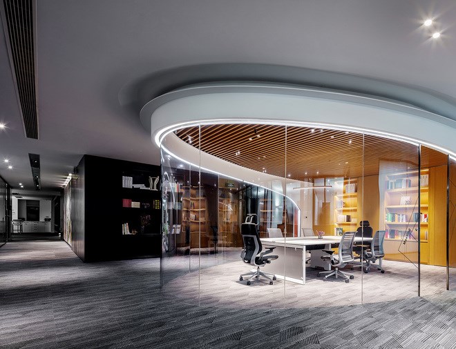 智能化燈光變幻,環繞式視頻投影,加強了空間的未來感與科技感。這里既是前臺區也是展覽空間。減去多余的裝飾,在設計上,峻佳化繁為簡,創造一個純粹神秘的空間,展示著一個品牌的未來想象力。辦公室與展廳的多重變奏,空間既要獨立而連貫又互不干擾,由超前未來區到專業辦公功能展示區,這是設計的一次變奏。