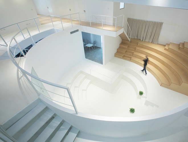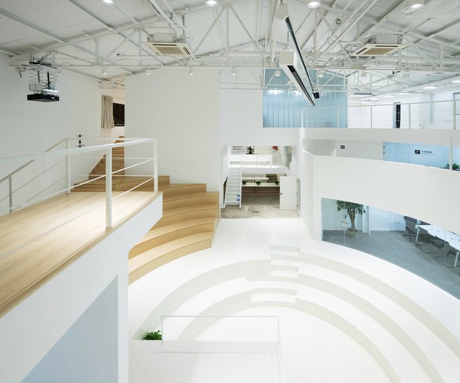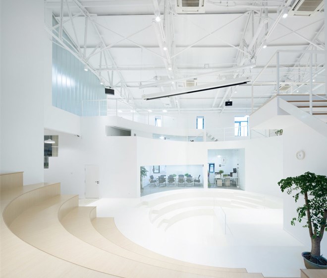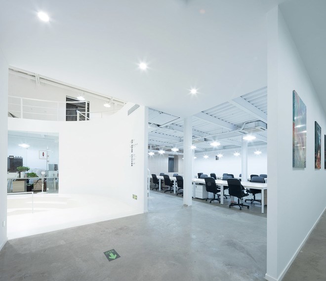動畫片制作特殊的工作流程,分為前期中期后期三部分。前期制作需要相對自由的氛圍,能帶動創新思考的舒適空間。中期制作作為工作主體,對空間的靈活性和開闊性較有要求。而后期制作則要求嚴格控制光線進入空間內部。彼岸天團隊由創業,發展到現在形成以年輕人為主的一個大家庭氛圍,有自己的廚師,員工晚上有時會加班睡在工作室里。根據這三個不同工作目標的團體的需求,建筑師在這個空曠的方盒子內進行重新規劃,在整個大的空間里面限定出眾多圍和與半圍和的室內空間,以滿足不同的使用需求。