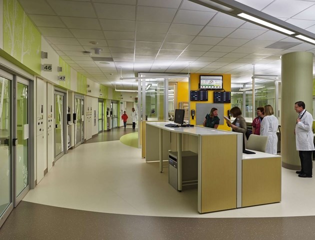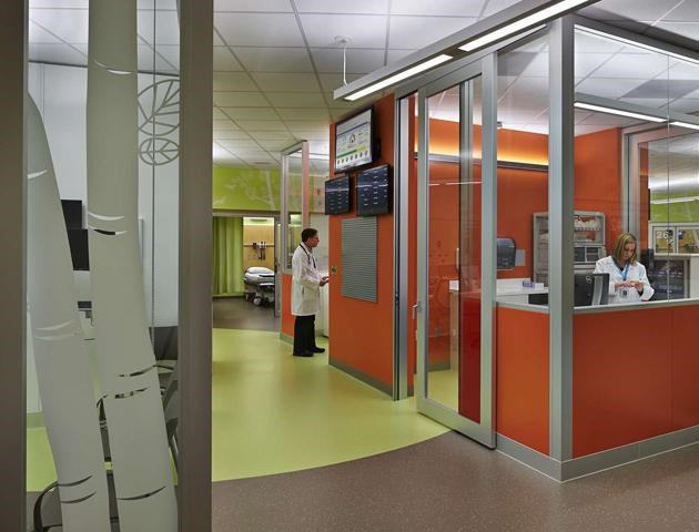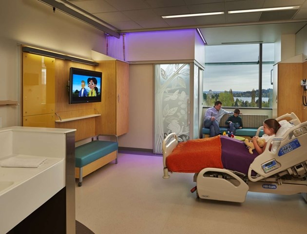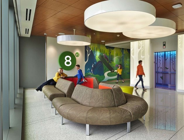 在這座大樓的設計理念中融入了自然和地區的概念,也給人提供了明確的方向,并且指明方向,能夠減少壓力。多層次的方式也應用到音響設備上,對于提供一個有利于健康的環境十分重要。病人區的所有地板都是橡膠材質,能夠減少噪音。現代的干凈線條以及多彩的顏色建造了一個品牌故事,只有在西雅圖兒童醫院才有。不過這些以融合藝術為特色的室內設計對于21歲以下的病人十分有吸引力。有趣的圖案和藝術設計給空間帶來了愉悅的元素。