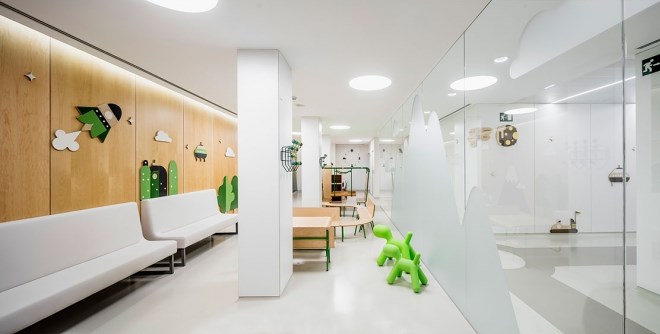 里面有專業的醫療團隊和溫馨的就診環境,不管是病人還是護理人員,都會在這里找到愉悅和舒心。為了達到這一目的,Toormix設計團隊以及合作的Plasencia Arquitectura施工團隊,將這個日??醋o中心分為三個區域:等候區、用藥咨詢室、以及治療室。