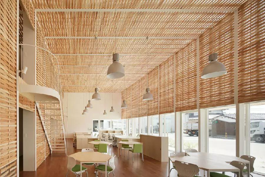 這是位于日本福岡某木材回收公司的辦公室。辦公室設計使用了可回收材料和自然能源,這十分符合該公司形象定位。辦公室建筑的墻壁和天花都是玻璃的,內部覆蓋上一層編織如柳框圖樣的木條層,這層材料讓白天的天光變得柔和,人們不需要開燈就能辦公;這層材料也使辦公室不至于過熱,減少對空調的依賴。所使用木材來自回收的雪松木材。自然清新環保節能的項目。