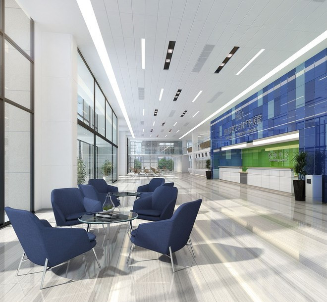 空間設計主要結合企業文化進行更好的闡述,企業的標準色主要分藍色和綠色,這兩種顏色都屬于可以給患者帶來安靜,平穩的心情的顏色。
