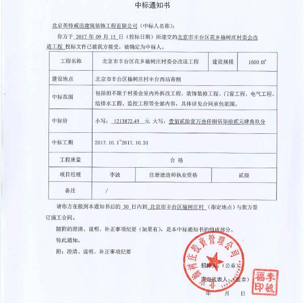 北京英特威迅建筑裝飾工程有限公司于2017年09月15日所遞交的北京市豐臺(tái)區(qū)花鄉(xiāng)榆樹莊村委會(huì)改造工程投標(biāo)文件已被我方接受,被確定為中標(biāo)人。